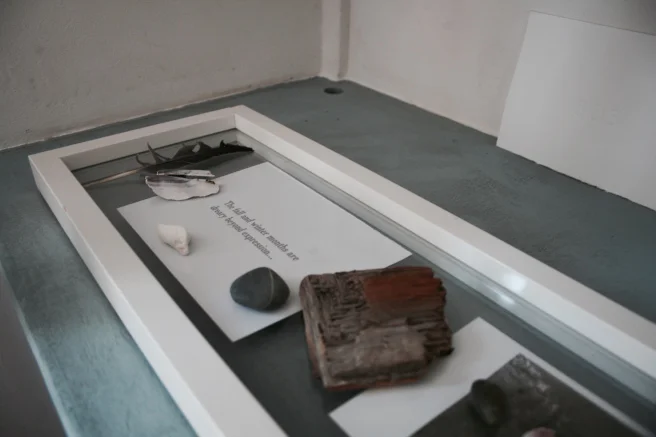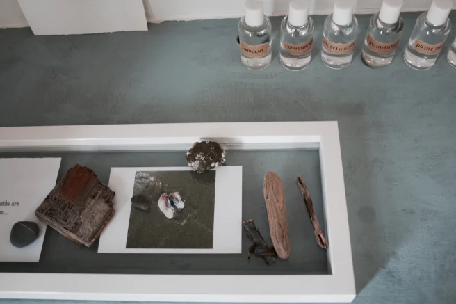 Documentation of performance involving vials of sea water, the filling of a glass fish bowl and the making of pigment using Canadian Seawater and Fenland Mud - Gudrun Filipska.