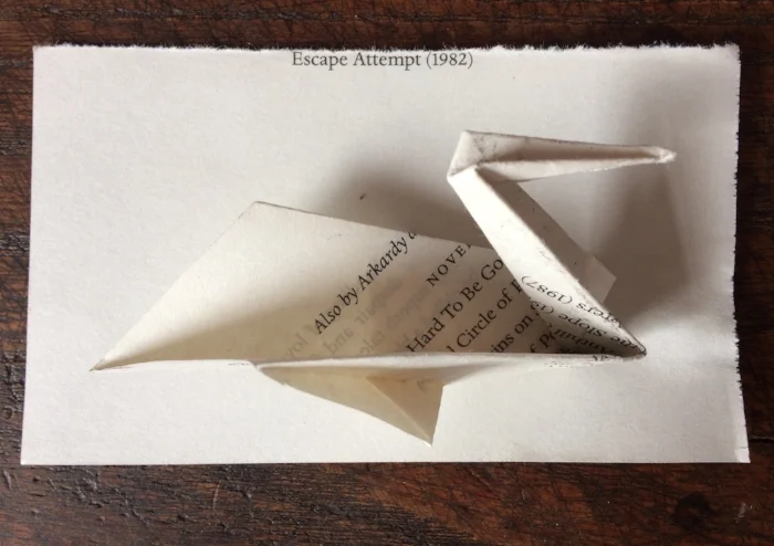 Interlope is a project which involves turning each of the 210 pages from Boris and Arkady Strugatski's Science fiction novel 'Roadside Picnic' in to an origami bird. An exercise in both digesting the text and origami incompetence. In the book, Red a 'Stalker' ventures illegally into a 'zone' to collect artefacts and debris left by an unknown ecological disaster or alien visitation – the location is an undisclosed but is widely assumed to be Russia. Parts of the narrative can be glimpsed on the folded sections of the birds and the small square of paper left behind after making them. this work develops ideas of language and silence, borders and boundaries and the complicated systems of propaganda at work in creating fables both in celebration of the soviet Empire and its demise. In 1979 Andrei tarkowski made a film called 'Stalker' based on the narrative of 'Roadside Picnic' developing the concept of the 'Zone'. Tarkowsky was exiled by the Russian government due to the anti-soviet sentiment expressed in his films ( the Zone widely thought to be a critique of the Gulags) and died not long later from a disease widely attributed to the time spent shooting 'Stalker' on toxic wastelands. This work begins to develop these narratives through the small gestures of reading and paper folding, making reference to systems of understanding and knowledge acquisition whilst using the emblem of the bird as conduit.